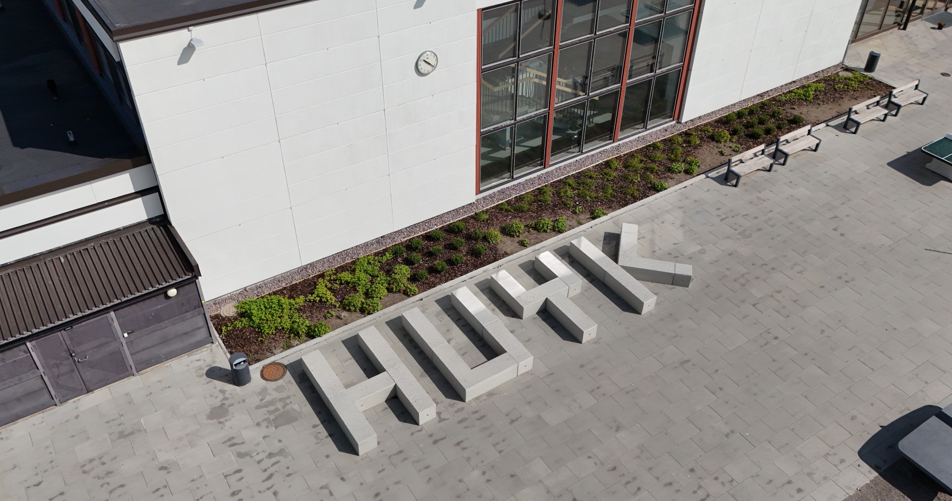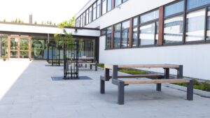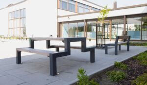 Suunnitelmassa kohteeseen valikoitui mukaan myös perinteisempiä penkkejä ja piknik-pöytiä hollantilaiselta Falcolta. ” Falco-sarjan tuotteet valikoituivat HUYK:n pihaan jämäkkyytensä, kestävyytensä ja välituntipihaan soveltuvan muotokielensä puolesta. Myös tuotteiden ympäristönäkökulmat vaikuttivat valintaan”, Tervonen kertoo.