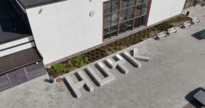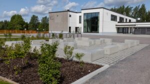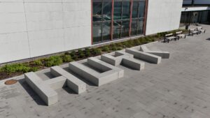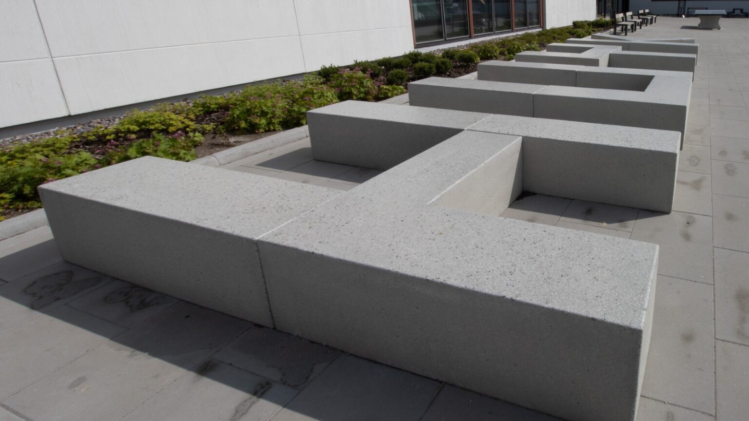 Kohteen piha-alueet suunnitellut Mirja Tervonen kertoo, että kohteeseen etsittiin eleettömiä ja selkeälinjaisia kalusteita, jotka eivät näyttäisi heti perinteisiltä penkeiltä. Tähän tarkoitukseen valikoitui Bellitalian Labyrinth-sarjan betonituotteet.