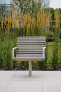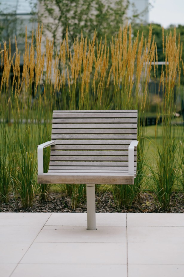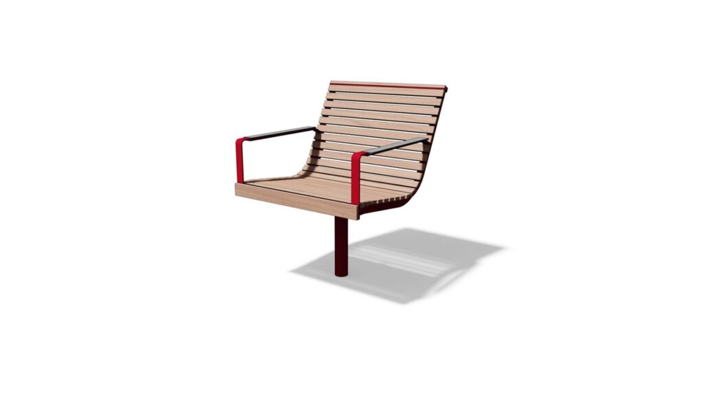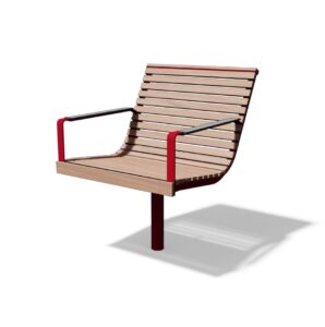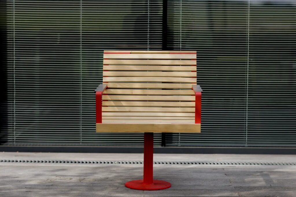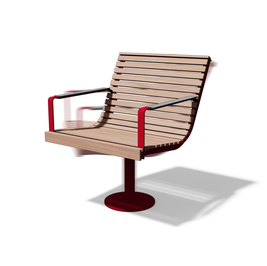Tässä yhdistyvät teräs ja puu. Tuolissa on yksi jalka keskellä ja voidaan valita kiinteä tai